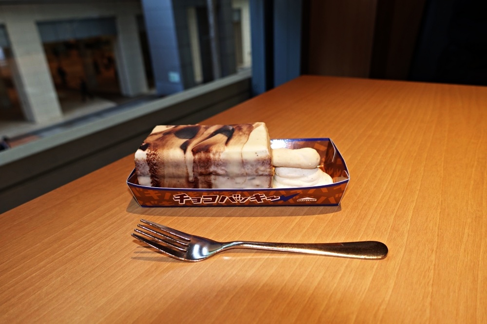 その少し後に、この店に行ったら、ショーケースの中に「チョコバッキー THE CAKE」が並んでいた。そこで「話の種」にと思いすぐに買って2階のカフェで食べてみたが、ケーキにしては不思議な食感だった。