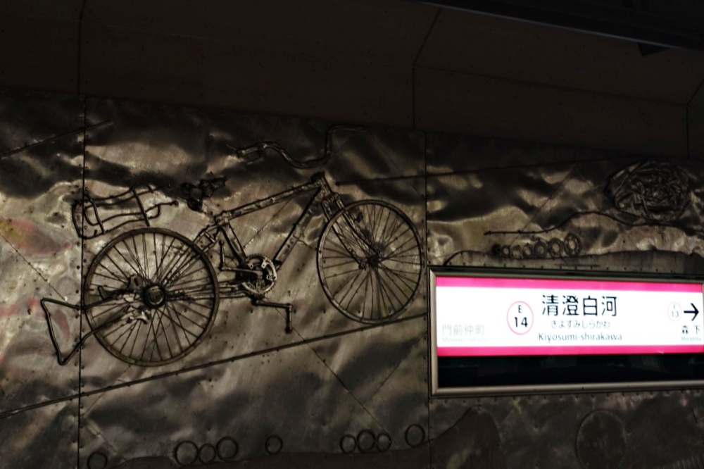 私はそれをあまり気にしない。清澄白河駅で3分くらい、次の「東京都庁前」行きを待つ。その時にホームの壁に素晴らしいアートがあるので、それを楽しむのである。