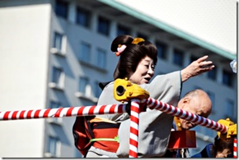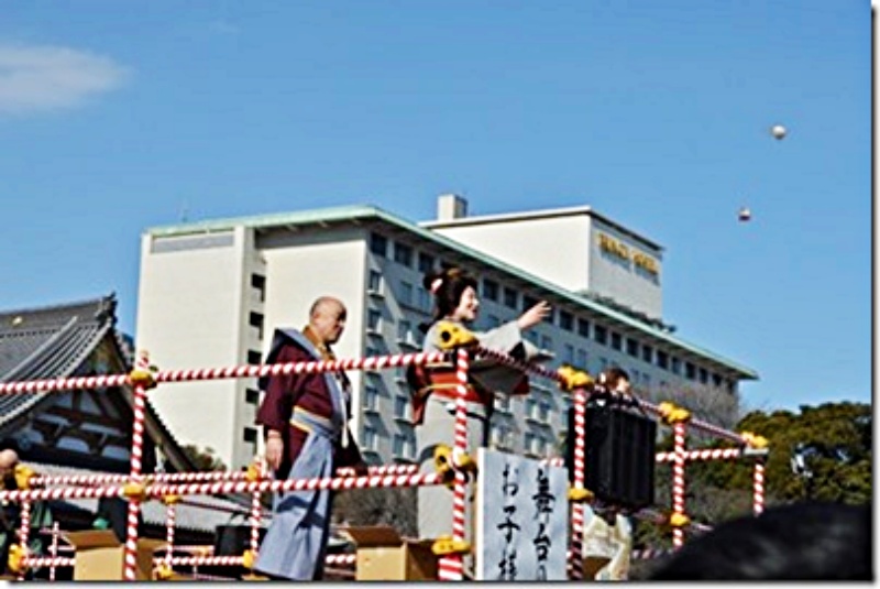 先ずは舞台の上から年男、年女が餅を撒く。そこに登場したのが女優の水谷八重子である。彼女は私より3歳も年上なのに、かなりの美人である。