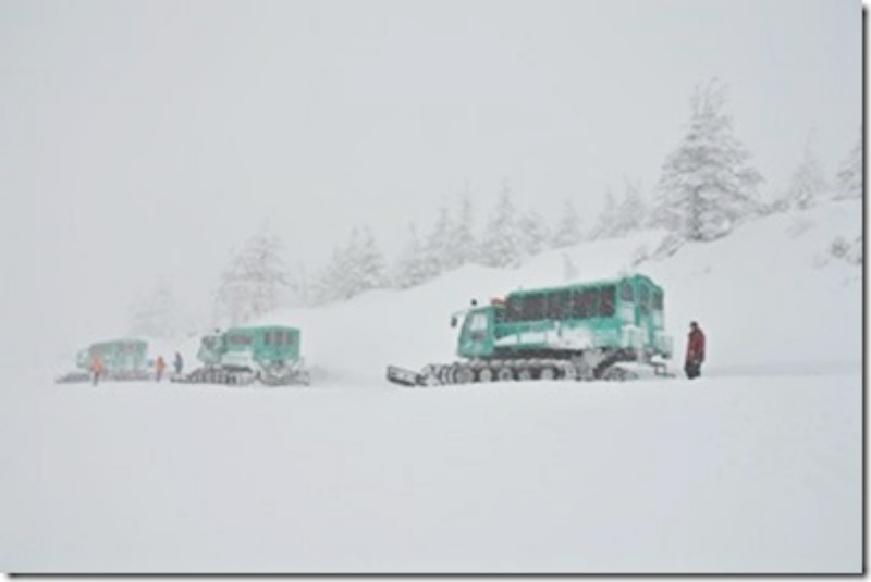 幸いに少し吹雪が収まり、午前11時に4台の雪上車で頂上を目指す。