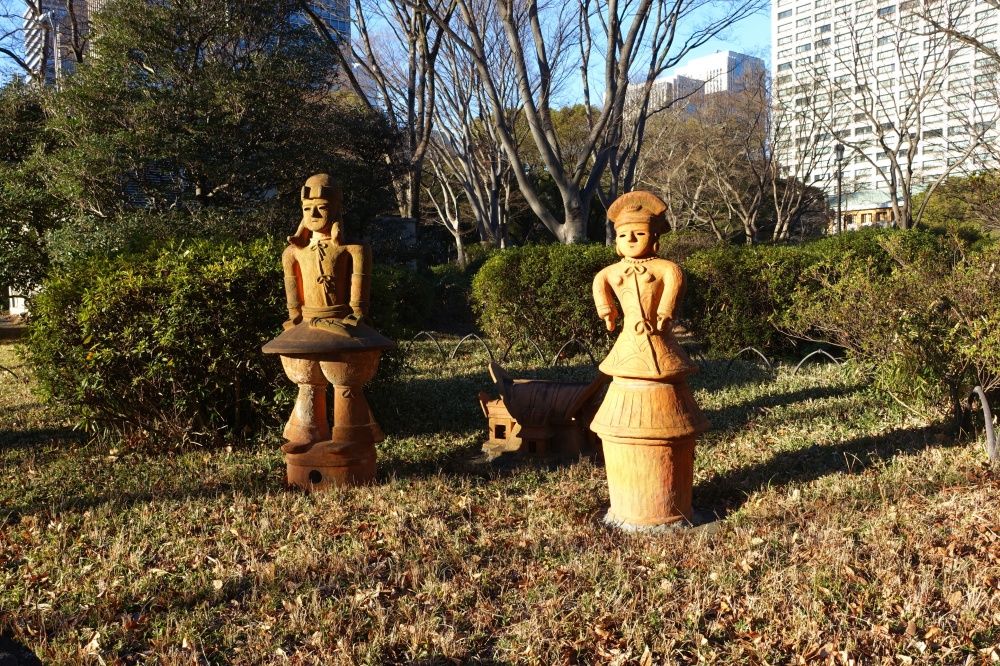 公園の工事中の場所を通り抜けて、少し左に行くと2体の埴輪が立っている。