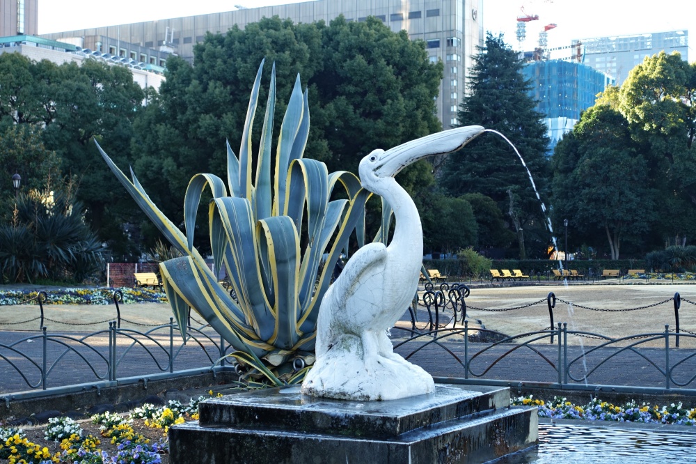 資料によると『ペリカン噴水は、日比谷公園の第一花壇の北側に位置しています。第一花壇は、日本初の様式庭園であるドイツ式の沈床花壇で、バラやシュロノキなど、四季折々の花々が楽しめます』とあり、誰かから寄贈されたのだが作者も不明である。