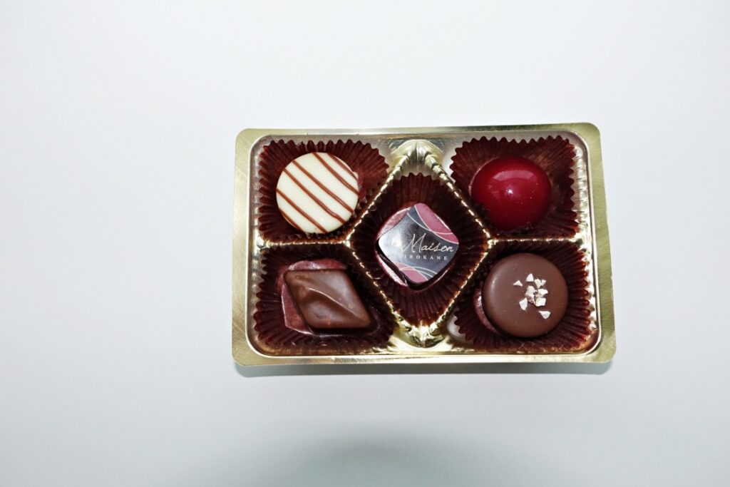 写真の説明だが、箱に入っていた説明書によると、左上(メープル風クリーム)、右上(カシス風味ガナッシュ)、左下(フィアンティーヌ入りミルクコーヒー風味)、右下(アーモンドクリーム)、中央(ビターカナッシュ)となっていた。