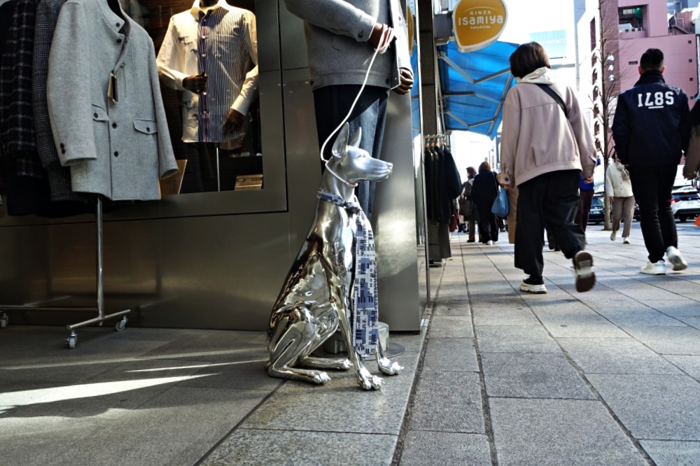 ここは古くから「ネクタイ」で有名である。最近はネクタイをしない人が増えているので、商売は厳しいか? 店の前に銀メッキの大きな犬がいる。