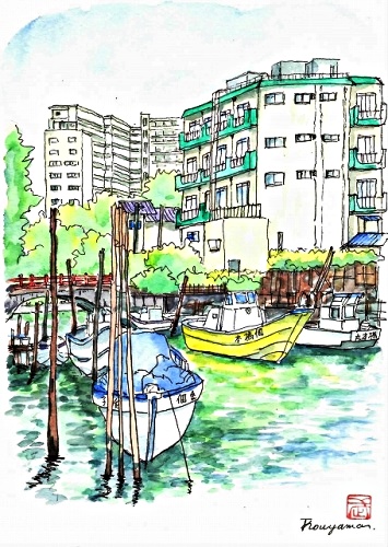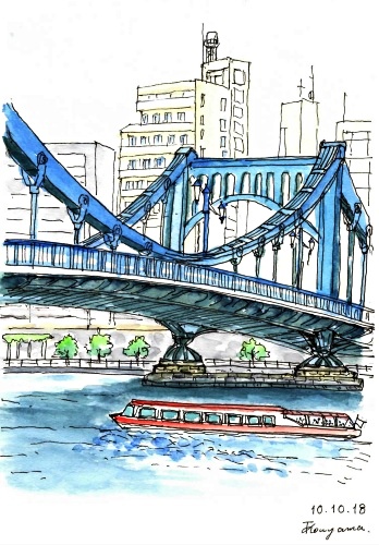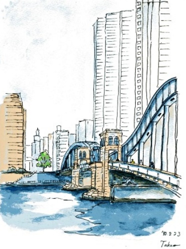赤い欄干の「佃小橋」の上から、水路と「リバーシティ21」を描いている。