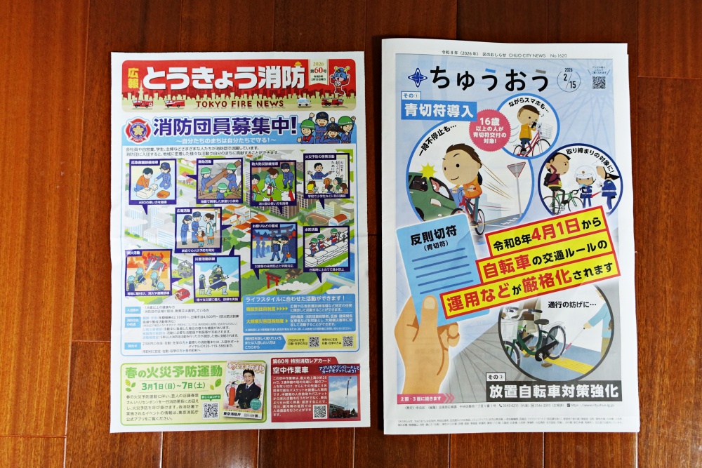 家に配達される新聞には広告と共に、「中央区報」や「区議会報告」、「消防」などのお知らせが入って来る。