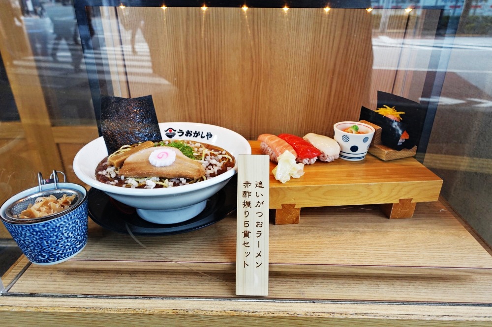 私は今までに「ラーメンと寿司」を同時に食べたことは無いし、多くの人も私と同じだろう。サンプルが店頭に飾ってあるくらいだから高級店ではないようで、ドアの横に券売機も置いてある。