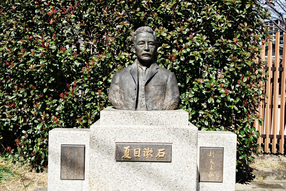銅像は大江戸線「牛込柳町駅」から徒歩10分くらいの、区立「漱石公園」の中の「漱石山房」の入口にある。
