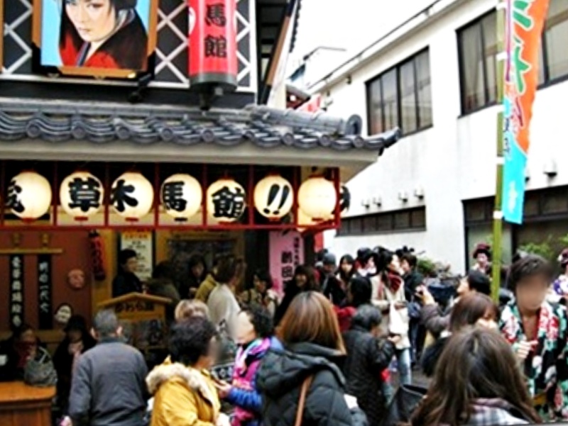 浅草寺に向って歩いていたら、木馬座がはねて役者で出て来てファンと交流していた。
