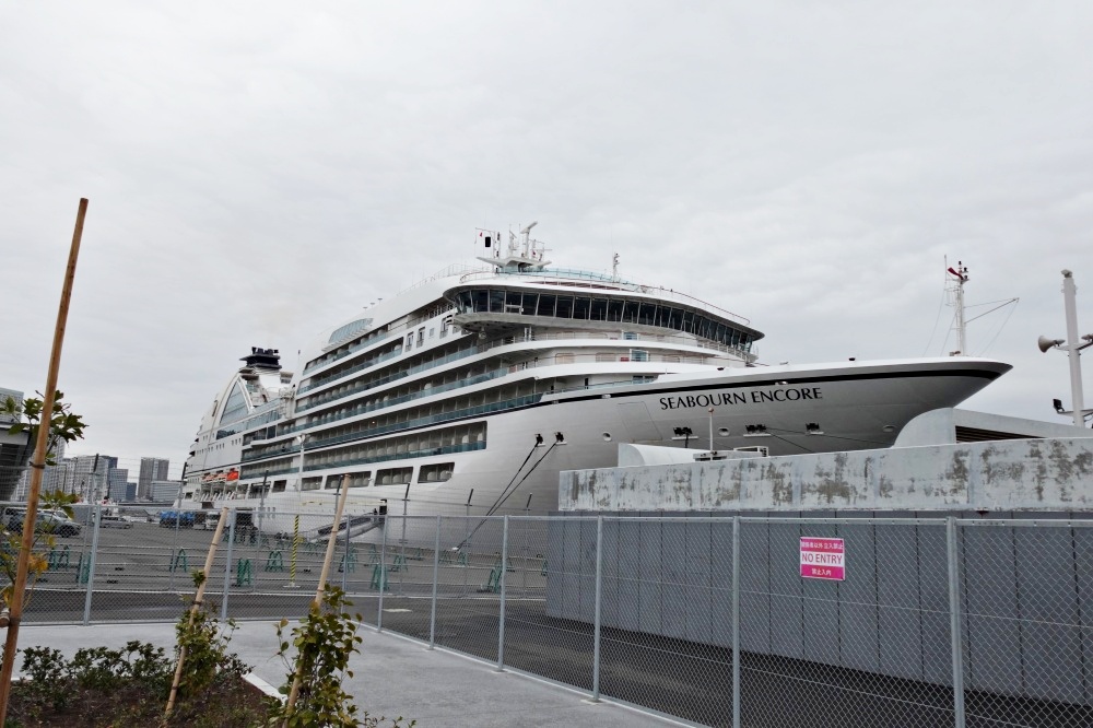 現地に行ったらなんだか違うクルーズ船が入港していて、白人乗客達が都内に出掛けるところだった。入港していたのは米国の「SEVEN SEAS EXPLORE」で、乗客定員が600名という巨大なクルーズ船だった。