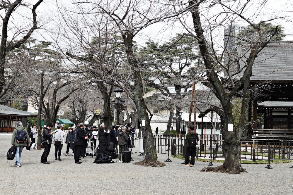 開花を知らせる標準木は、靖国神社の神楽殿の前にある。