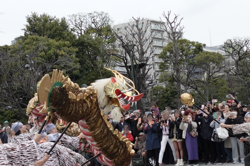 私は早目に行って良い場所を確保してと思ったら、いざ始まったら関係者が私の前に立ってしまった。金龍はドラの音と共に参道から広場に入って来た。なかなか勇壮な舞だった。見物客にはたまたま居合わせた外国人観光客も多く、嬉しそうに大きな拍手をしていた。