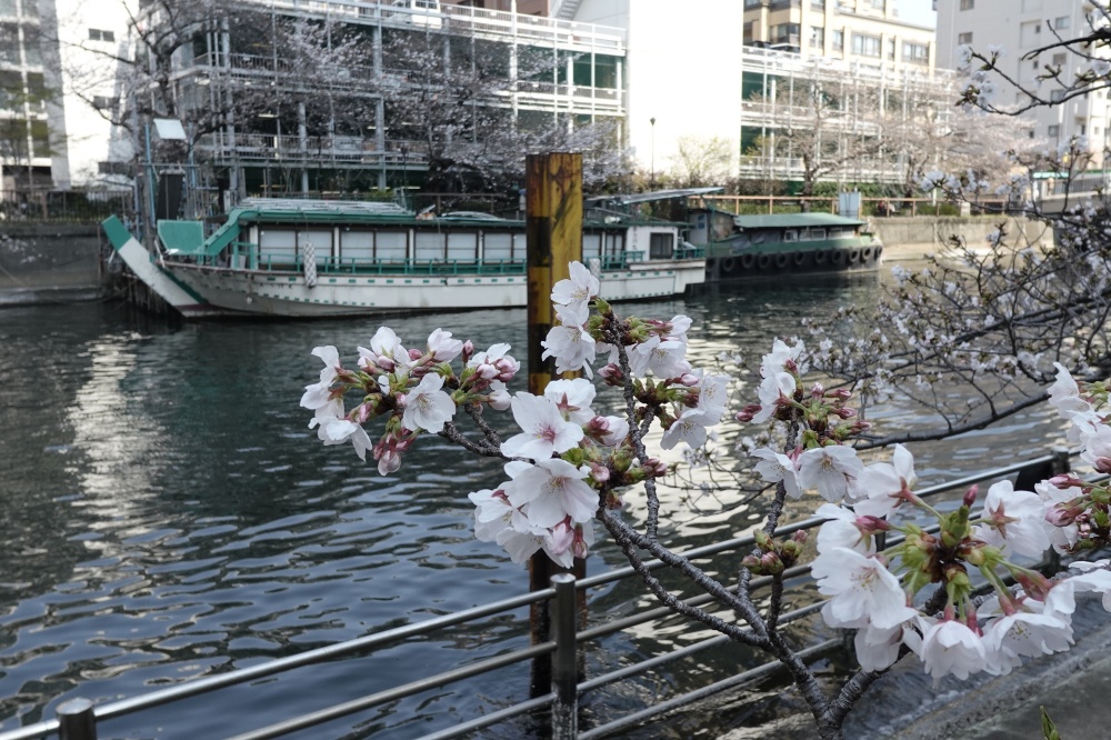 今年はすでに上流では満開のようだが、この辺りではまだ2分咲きで、「さくら観光船」が行き交っていた。