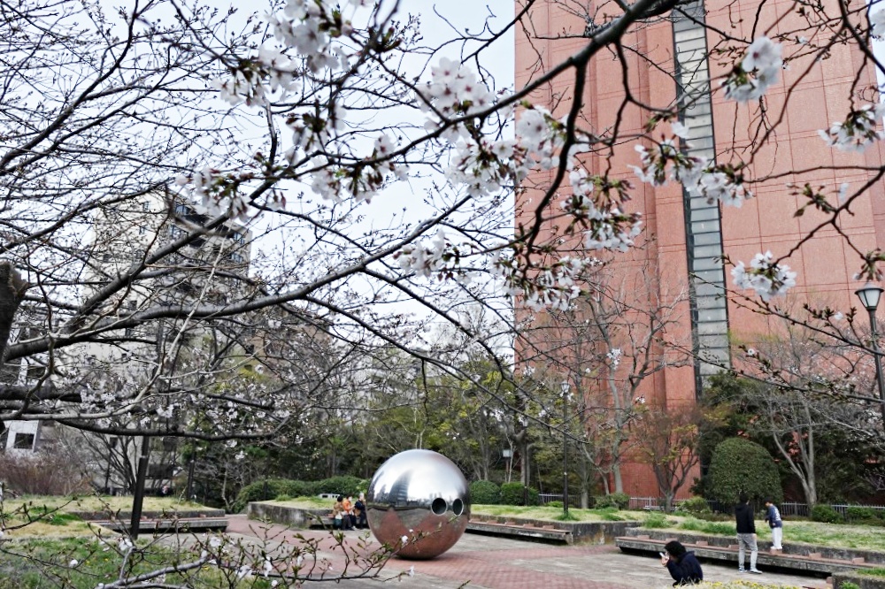 桜の木の数は少ないが、銀色の球を背景に入れた写真は絵になる。