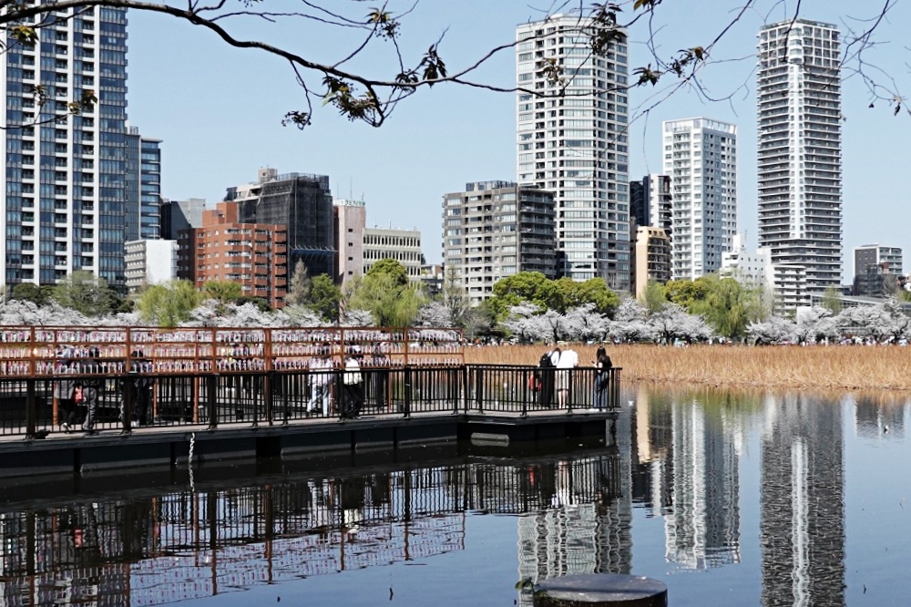 桜は満開を少し過ぎた頃で、池には花びらも浮いている。
