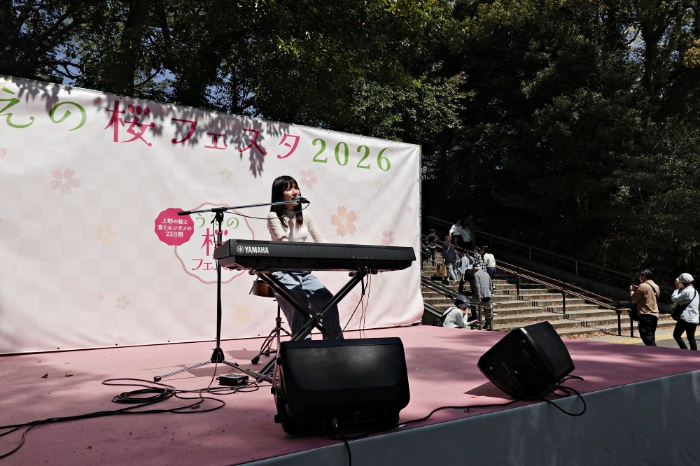 階段下には舞台が作られていて、若い女性がエレクトーンで弾き語りをしていた。