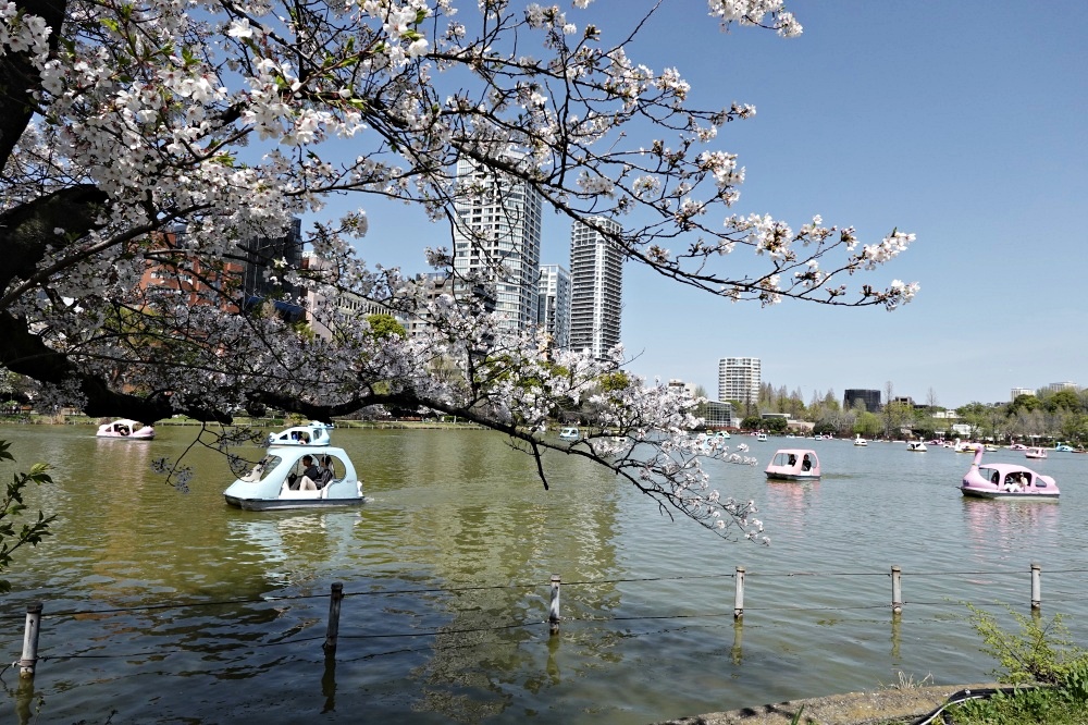 左側のボート池にはたくさんのスワンボートが出ている。