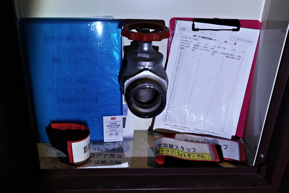 確認後、リーダーは5フロアごとにある拠点まで階段で行き、そこにいる防災委員かサポーターに報告する。防災委員は備蓄庫を開けて、そこにあるトランシーバーを取り出して準備しておく。