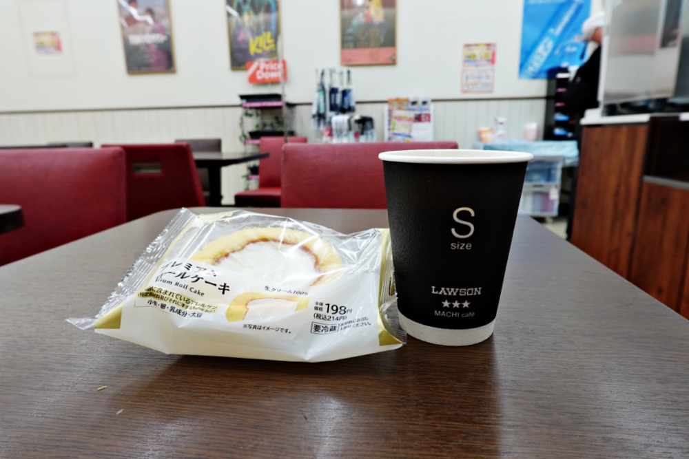 ホットコーヒー(小)とロールケーキを買うと、348円で休憩が出来るので安上りである。