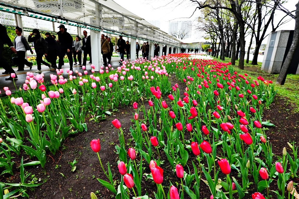 通路の左側の植え込みには大量のチューリップが植えられていて、来る人達を出迎えているように感じる。