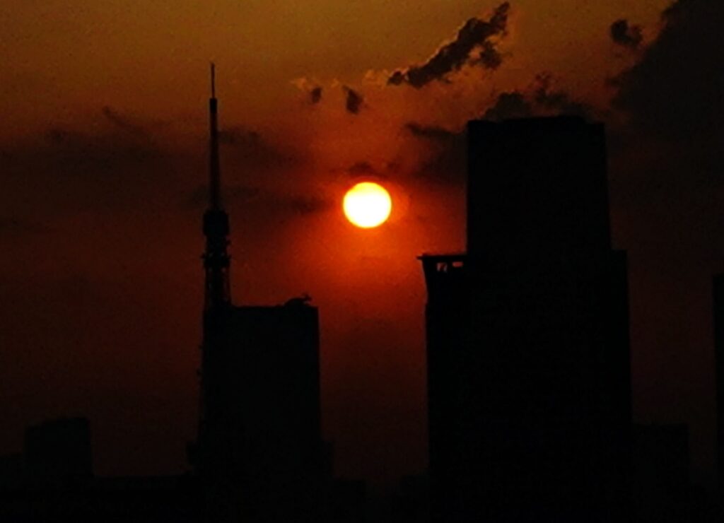 よく見たら、東京タワーと高層ビルの間にまん丸の太陽が沈んで行くのが見えた。