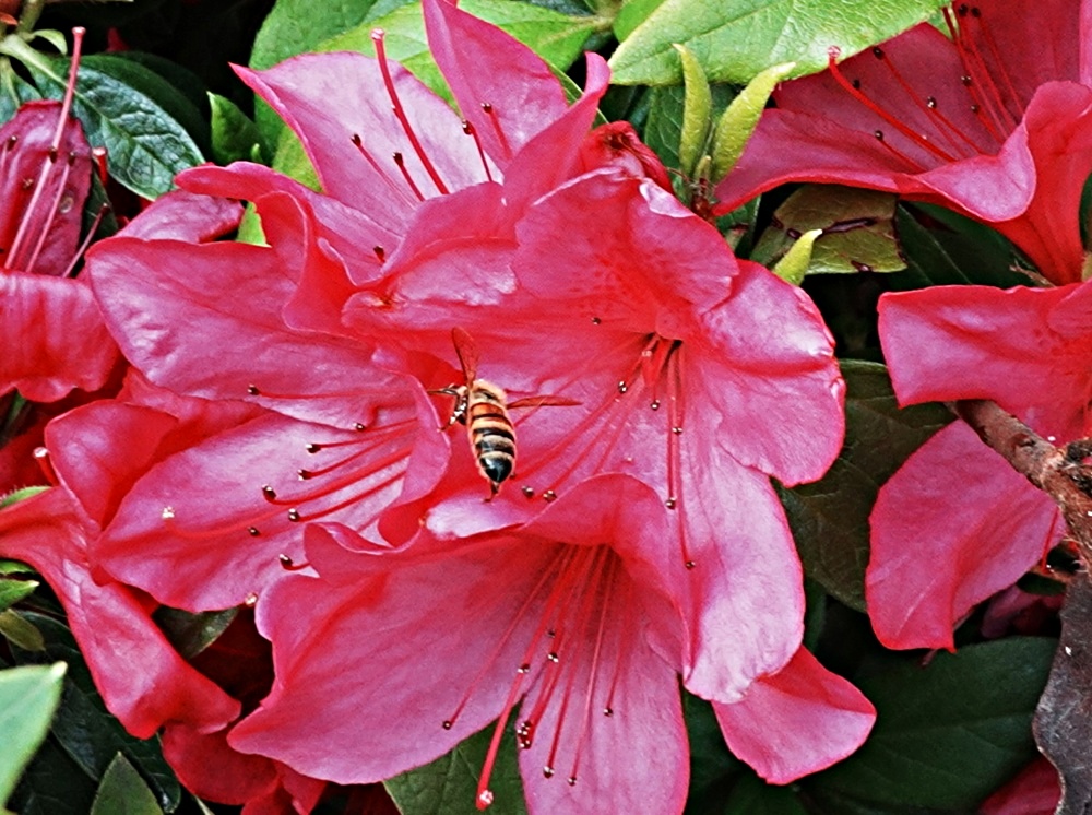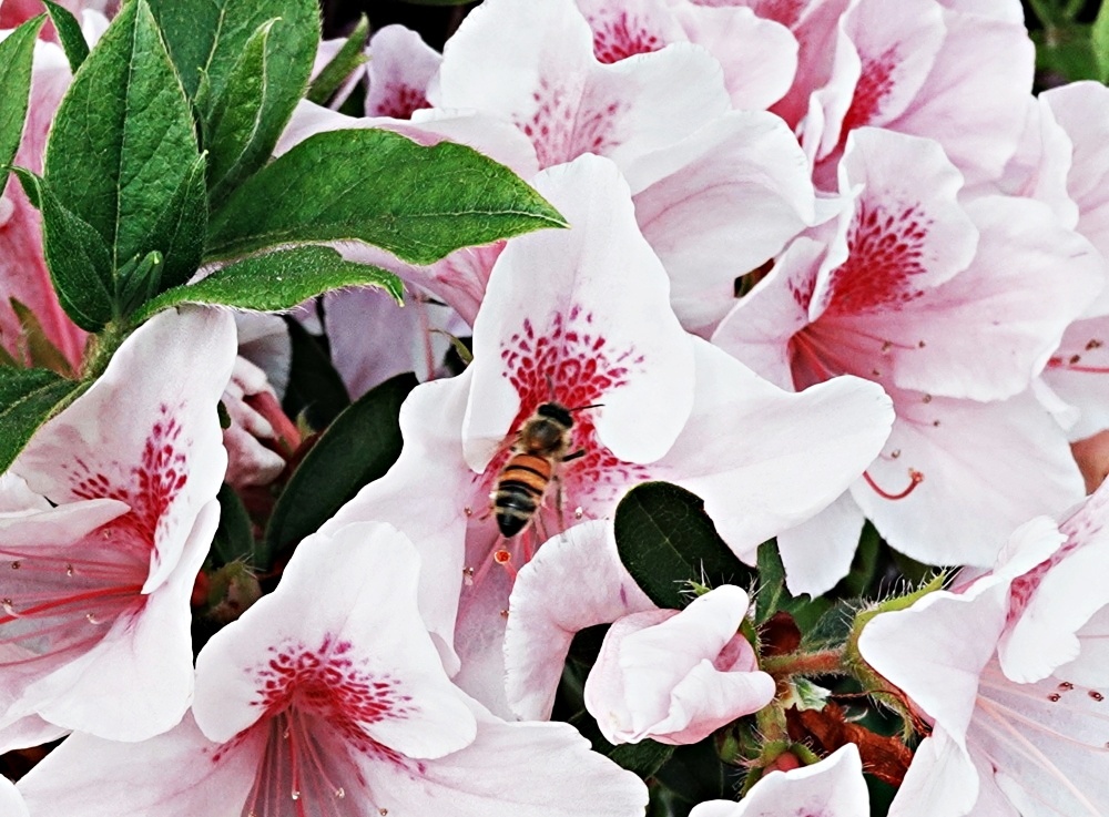 ツツジのクロースアップの写真は美しいです。花をよく見ると、そのデザインのユニークさと精巧さに、いつも驚かされます。そこにハチが無心に飛び交っているさまなど、この世の憂さも忘れます。