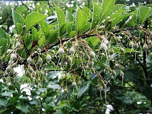 やっとそれらしき写真になったのが、今回のエゴノキの実に付いた水滴である。