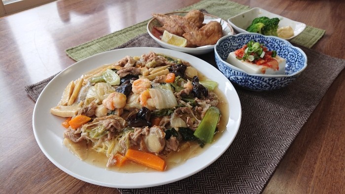 今日のメインは具沢山醤油あんかけ焼きそばです!