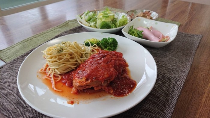 玉ねぎ、にんにく、ハーブ、トマト水煮でコトコトと