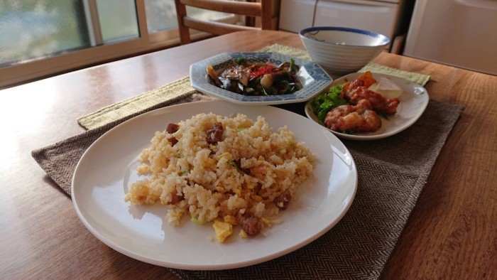麻婆茄子があるので、シンプルなチャーハンにしました。