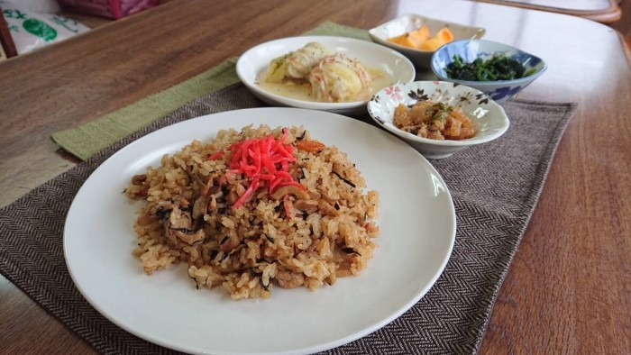 豚小口切り、ごぼう、木耳などを入れた豚めしです。