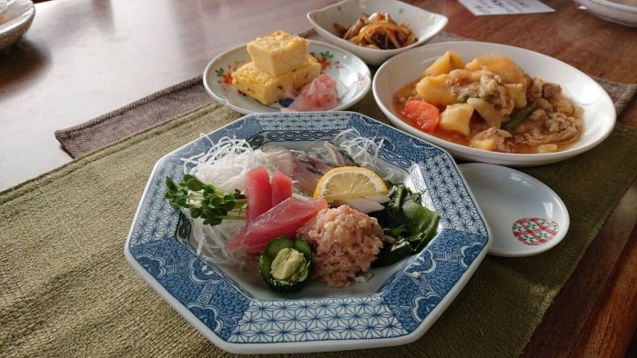 まぐろ、しめ鯖、ぶり、なめろうの三点盛りです。