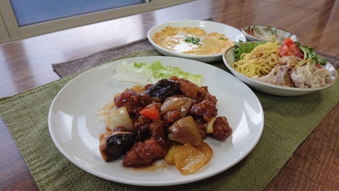 片栗粉で薄く餡をつけてから豚肉を戻します。
