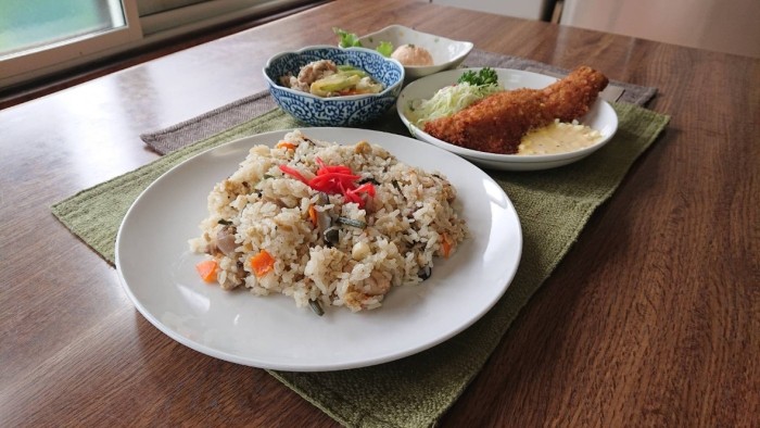 国産鶏もも肉、小口切り、山菜、ごぼう、油揚げなどを