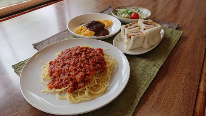 ミートソースにしました。チーズオムレツにもちぎったオレガノを