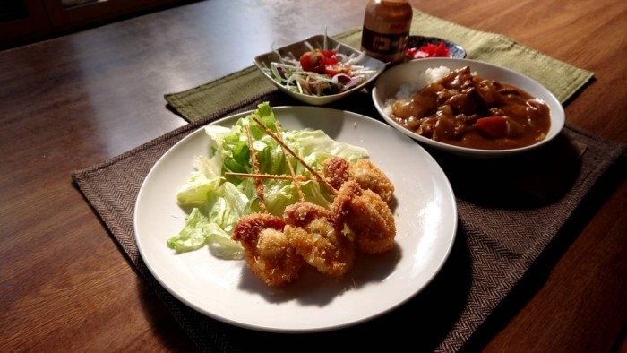 辛味をつけます。うずら、えび、ウインナーを串に刺して