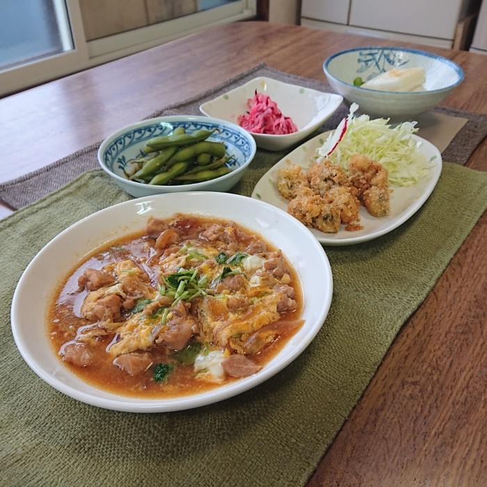 今日のメインは国産鶏もも肉の親子とじです!