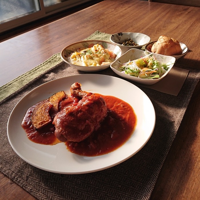 今日のメインは骨付き鶏のトマトソース煮込みです!