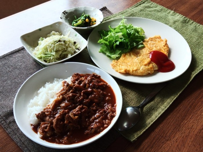 副菜にはチーズオムレツ。ハッシュドビーフのソースをかけても