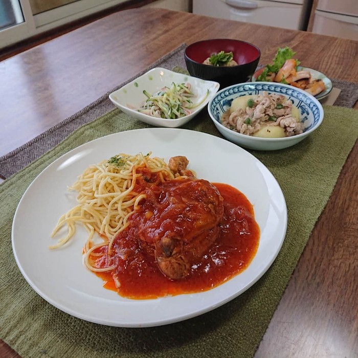 本日のメインは鶏骨付き肉のトマト煮込みです!