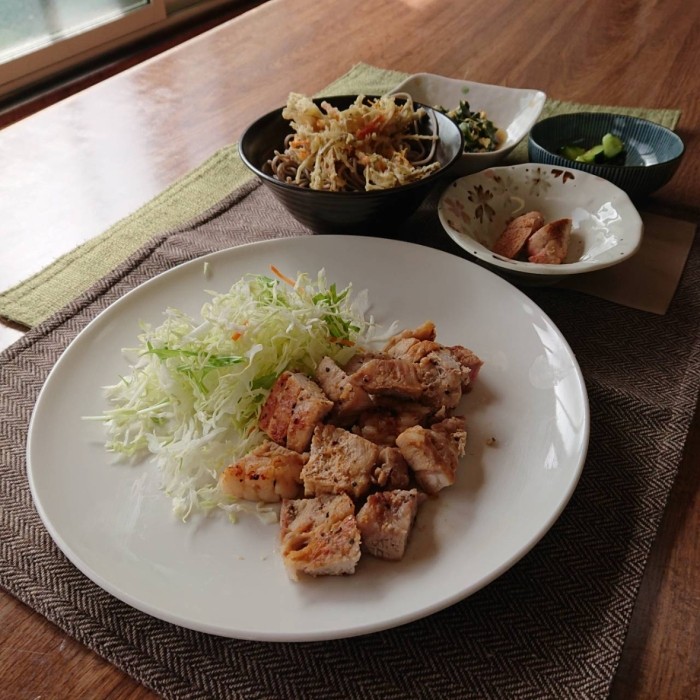 ご飯のお供に焼きたらこです。牛蒡のかき揚げが乗ったそばは、