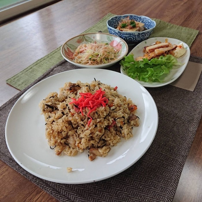 干ししいたけ、ひじきなどと一緒に混ぜご飯にしました。