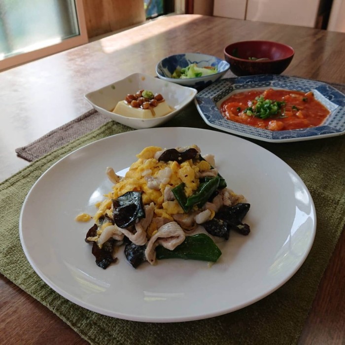 豚ロース、ピーマン、木クラゲ、ふんわり炒り卵を合わせた