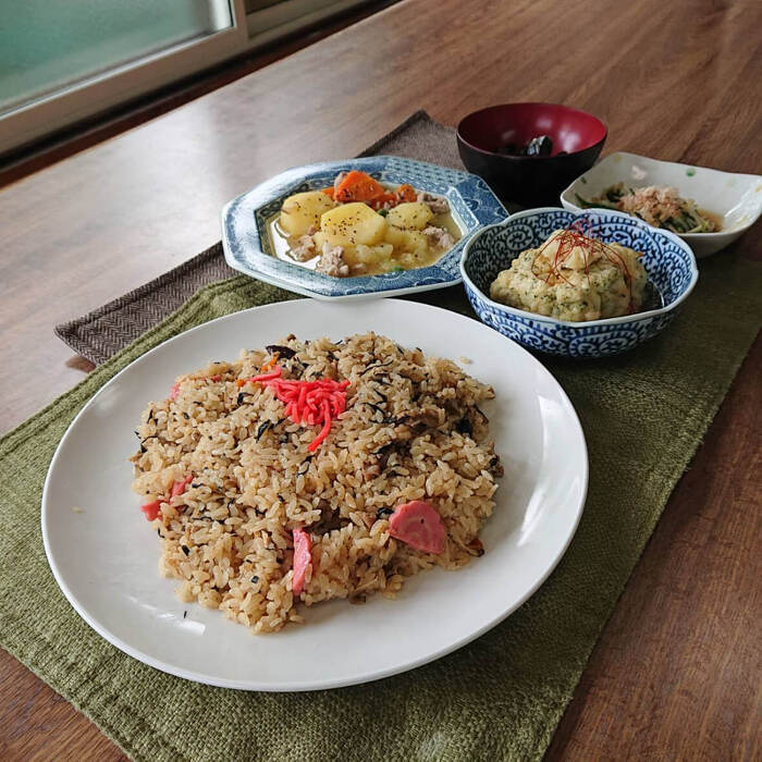ご飯の味は控えめにしました。豚バラ薄切り、または