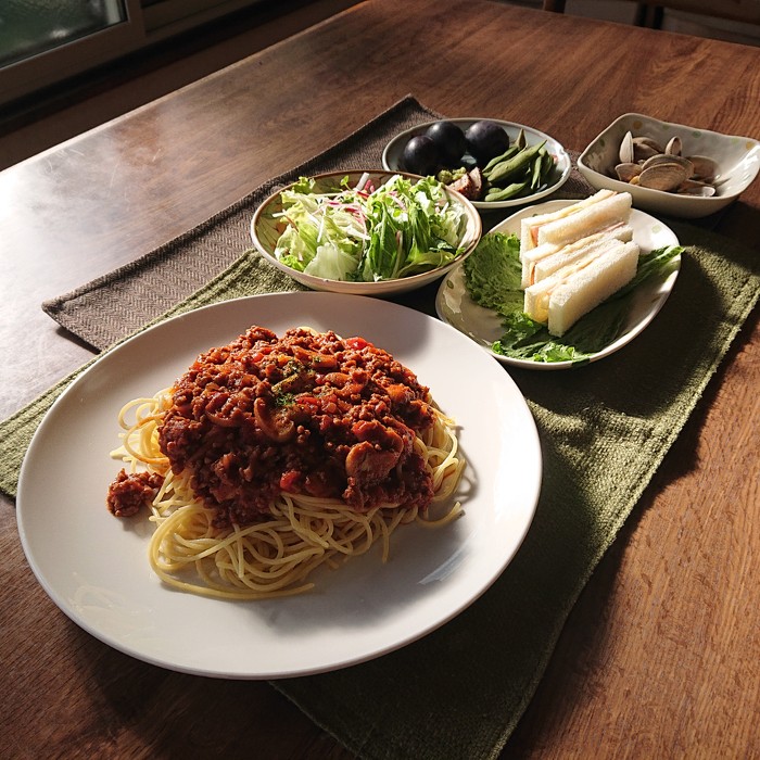 今日のメインはひき肉たっぷり、麺のボリューム満点!