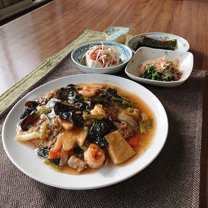 今日のメインは野菜たっぷり醤油あんかけ焼きそばです!