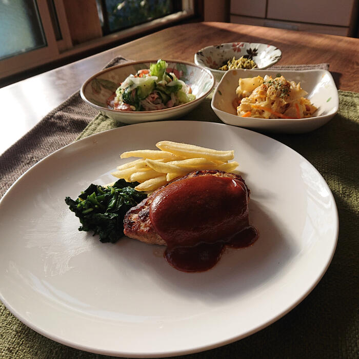 ハンバーグです。ソースは、デミとトマトを半々にしました。