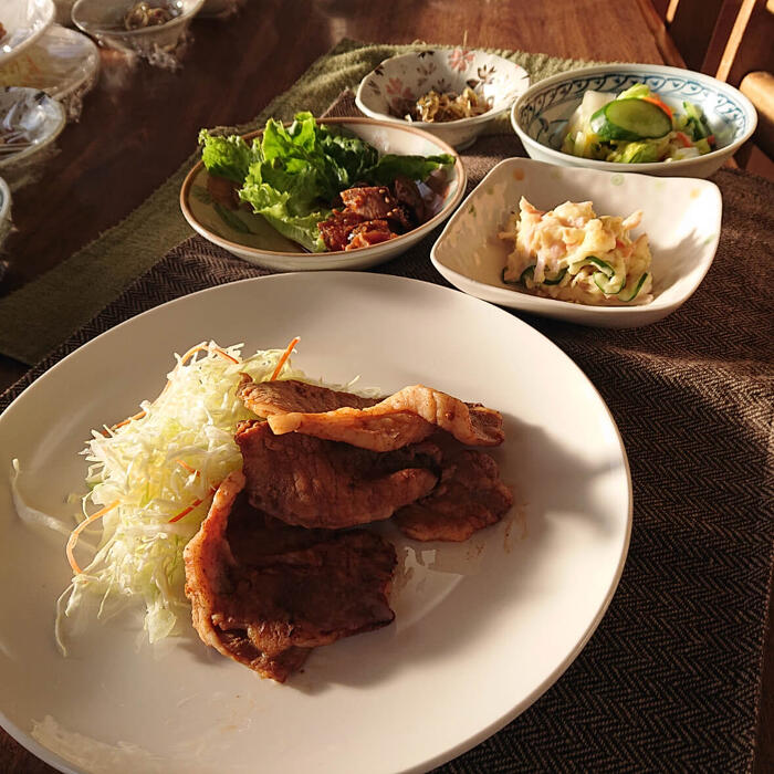 キャベツにどっこり乗せて豚の生姜焼きとともに