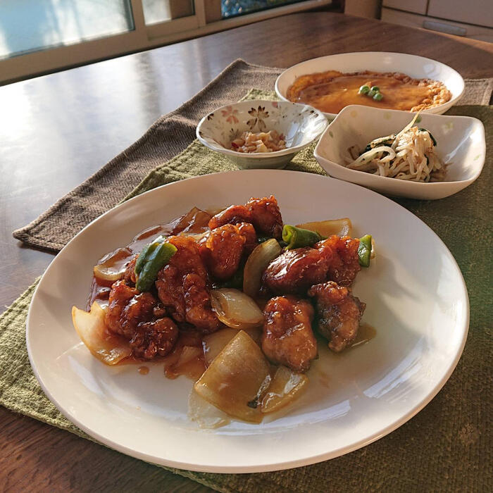 シンプルに。今日のかに玉は、酢豚が黒酢餡なので塩餡にしました。