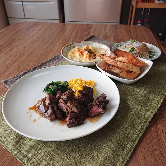 焼き網を熱く熱してステーキの両面をあぶり、ひと手間かけました。